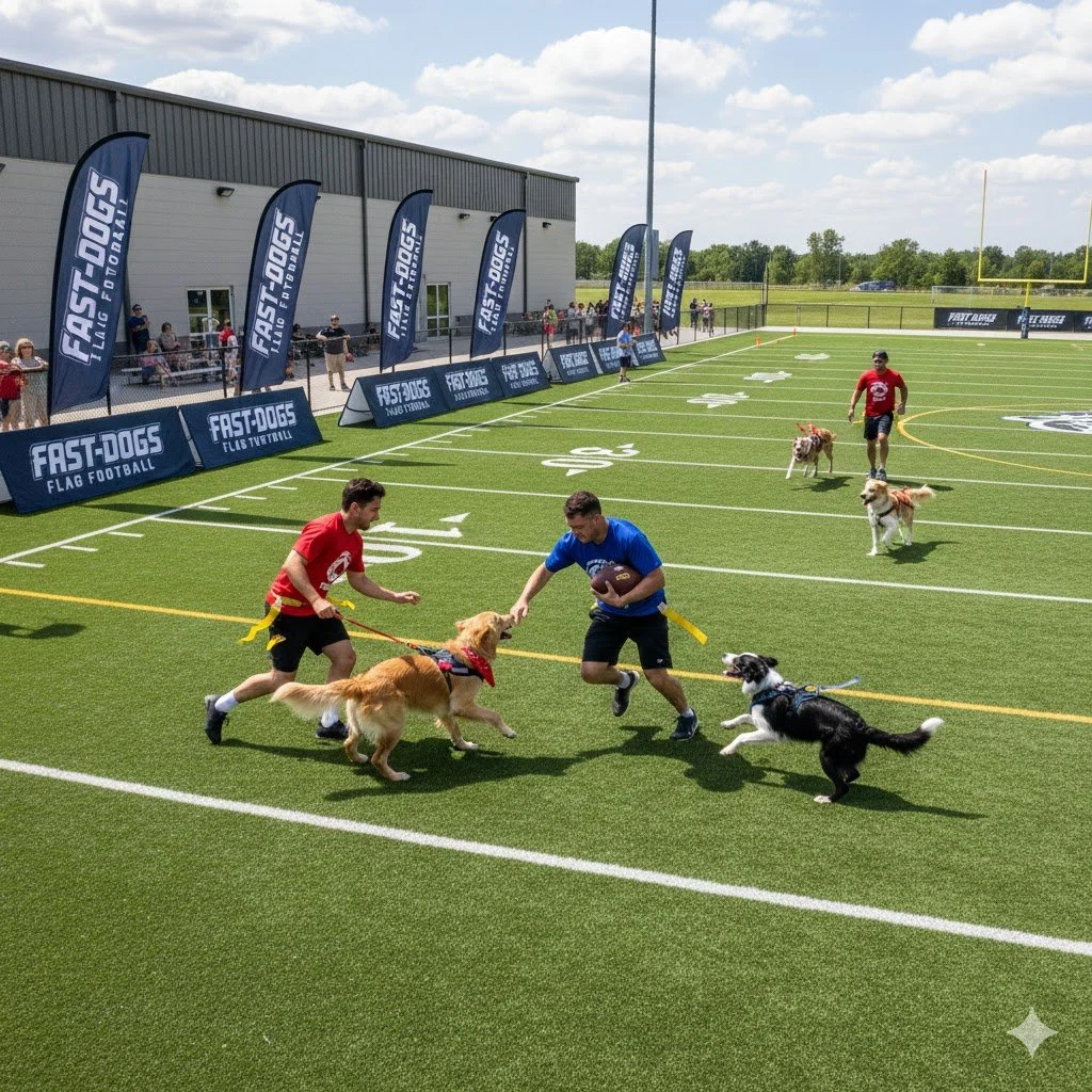 Fast-Dogs Frisbee Tag Football (FDFTF) is the ultimate team game, blending the strategy of football, the energy of dog fetch, and the precision of Frisbee. It is an ideal sport for our community, promoting teamwork, high-level obedience, and safe, explosive speed.
